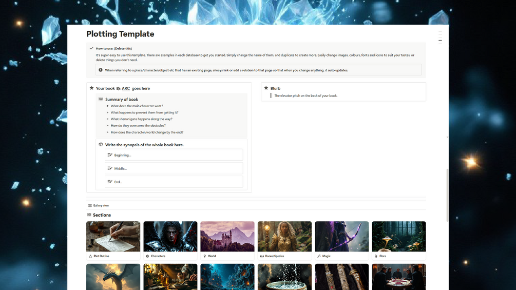 This template was built with fellow authors in mind, and allows you to create a page for every element of your worldbuilding, and then link it to everything else. MAGIC! So if you suddenly decide to re-name that character, city, or magical artefact, you only have to update the name once! No more find and replace.