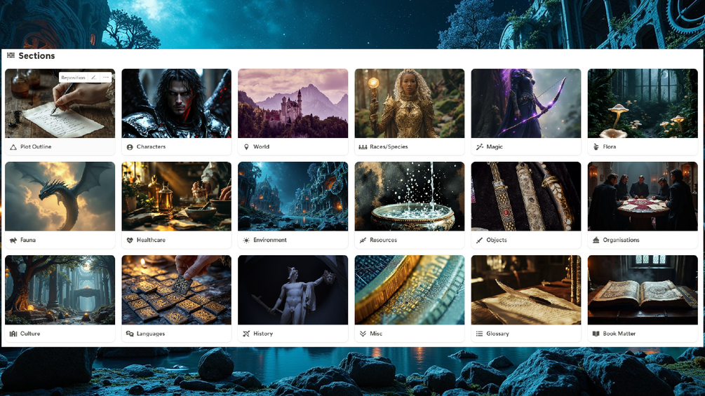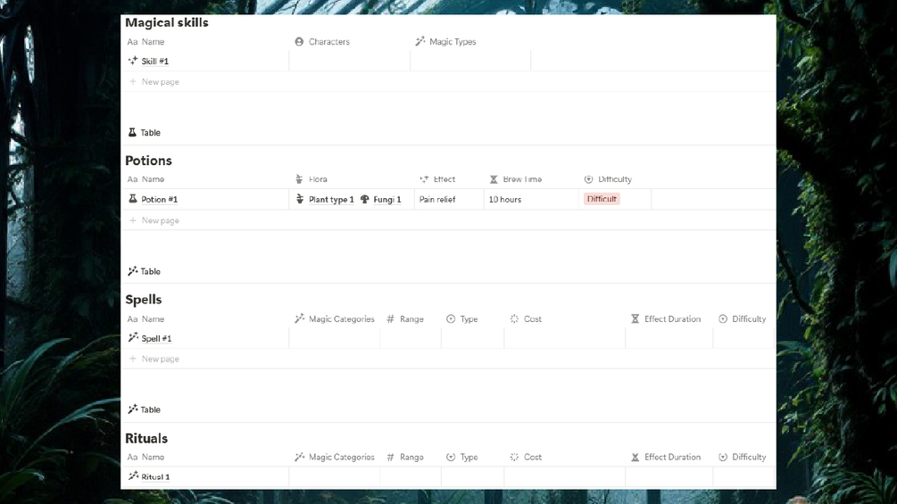 - Databases for magic systems/organisations/culture/flora and fauna/objects/currency/languages and many more!