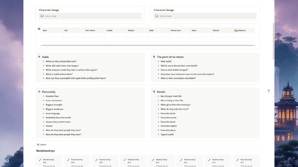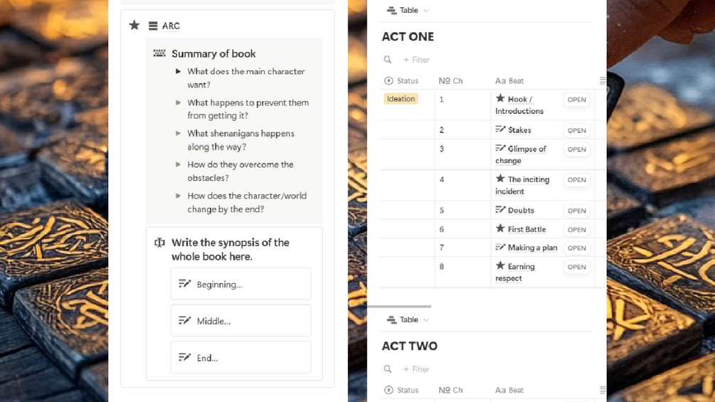 - 3 Arc plotting outline, that links to characters, locations and more. With prompts to help you plan your story. (Including optional romance beats from Romancing the Beat.